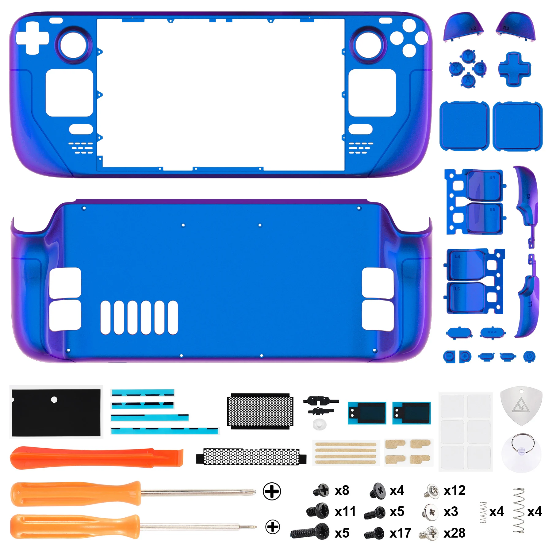 3. Requires customers to take apart the console to replace the original shells and buttons with eXtremeRate accessories. Requires customers with high hands-on skills, no soldering is required. Get the installation video guide on YouTube by searching “eXtremeRate Full Set Shell for Steam Deck” or “0tBE10fSYBc”.