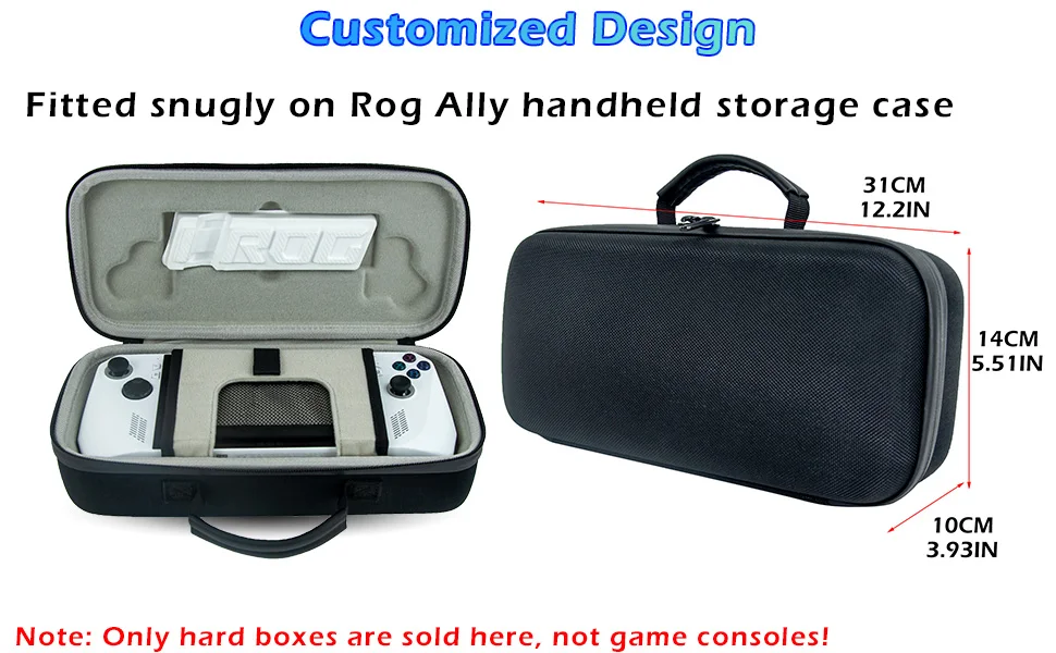| Hard Shell Portable Carrying Case Bag for Asus ROG Ally X Game Console Accessories Shockproof Waterproof Travel Case Storage Bag | $ | -Standard carrying case for ROG Ally, comes with the ability to prop the console up using a flap inside the case -Able to hold multiple accessories like chargers and small accessories -Has 5 cards slots to hold SD cards -Hard shell design with double zippers -12.2 x 5.51 x 3.93 inches (L x W x H) | $9.60 (prices can range) | Buy on AliExpress |