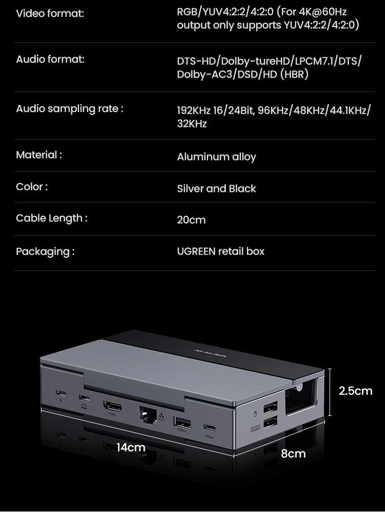 | Funtion | Card Reader, RJ45, USB-A, USB-C, Charging, HDMI-Compatible |