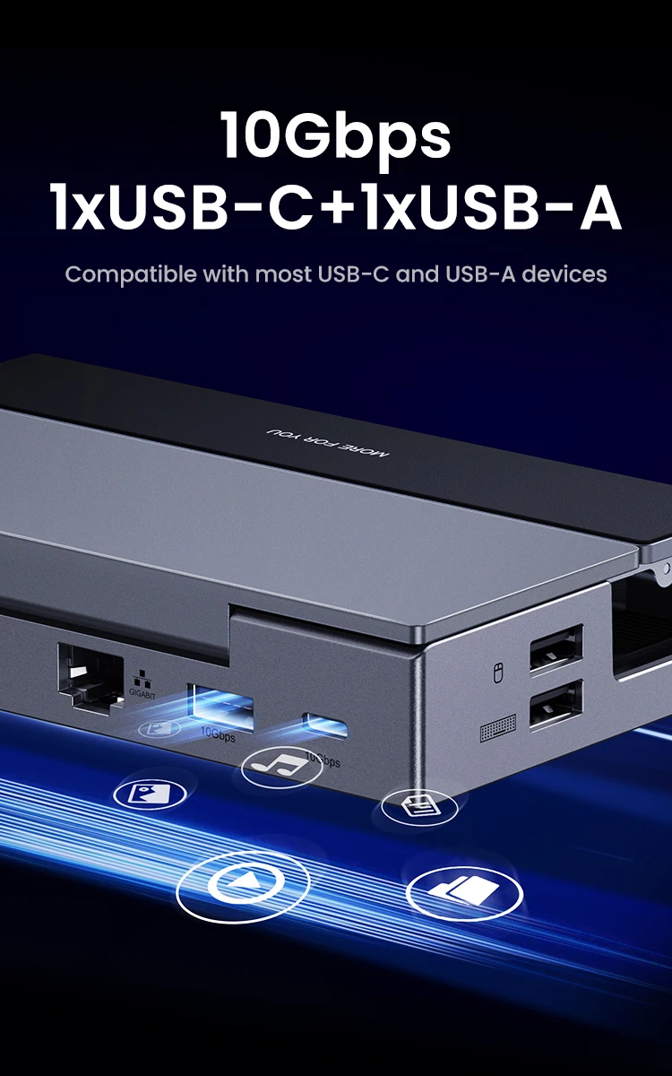 1xHDMI 4K@60Hz +1xUSB-C 3.2 10Gbps+1xUSB-A 3.2 10Gbps+1xRJ45 1000Mbps+1xPD 100W+1xSD 104MB/s+1xTF 104MB/s+2xUSB-A 2.0