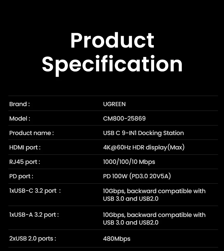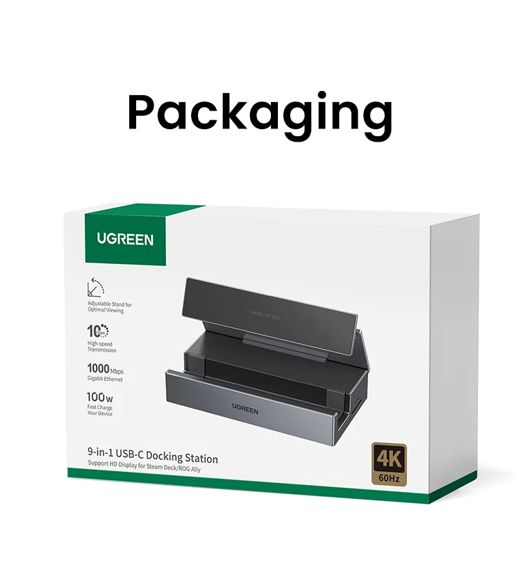 9-in-1 Expansion with 1xHDMI 4K@60Hz +1xUSB-C 3.2 10Gbps+1xUSB-A 3.2 10Gbps+1xRJ45 1000Mbps+1xPD 100W+1xSD 104MB/s+1xTF 104MB/s+2xUSB-A 2.0