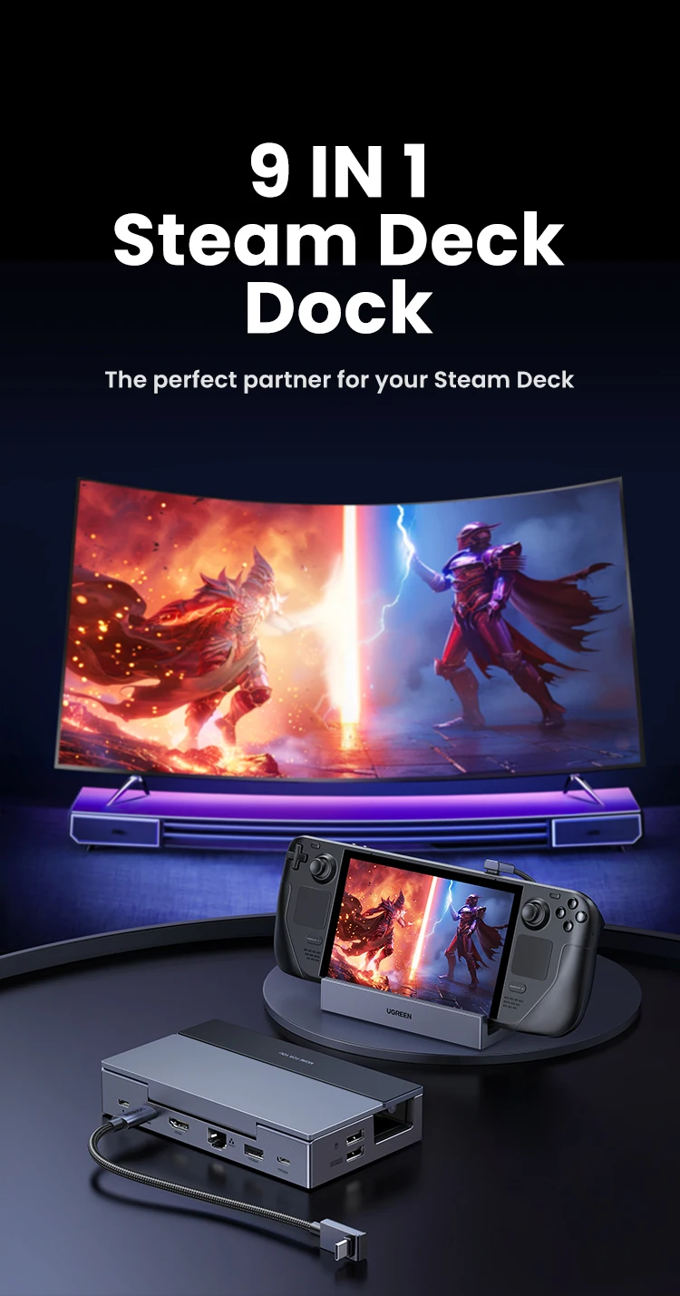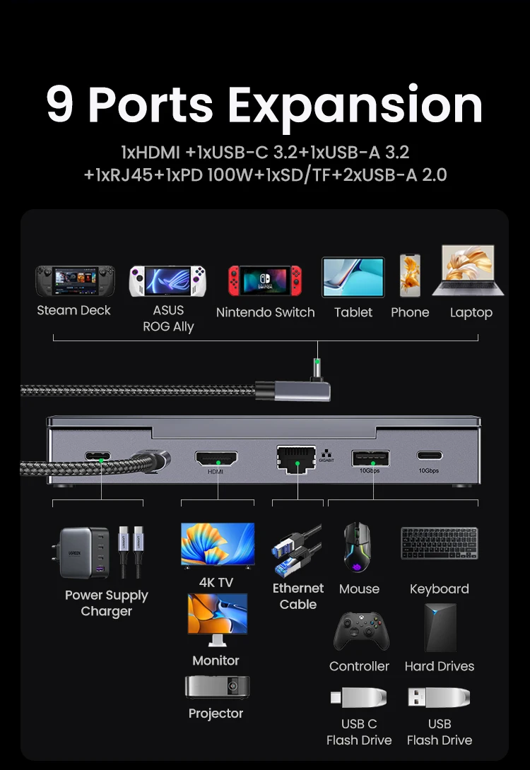 UGREEN Steam Deck Dock 4K60Hz 9 Ports RJ45 PD100W USB C HUB Compatible with Steam Deck ROG Ally LEGION Go iPhone 15 Pro/Pro Max