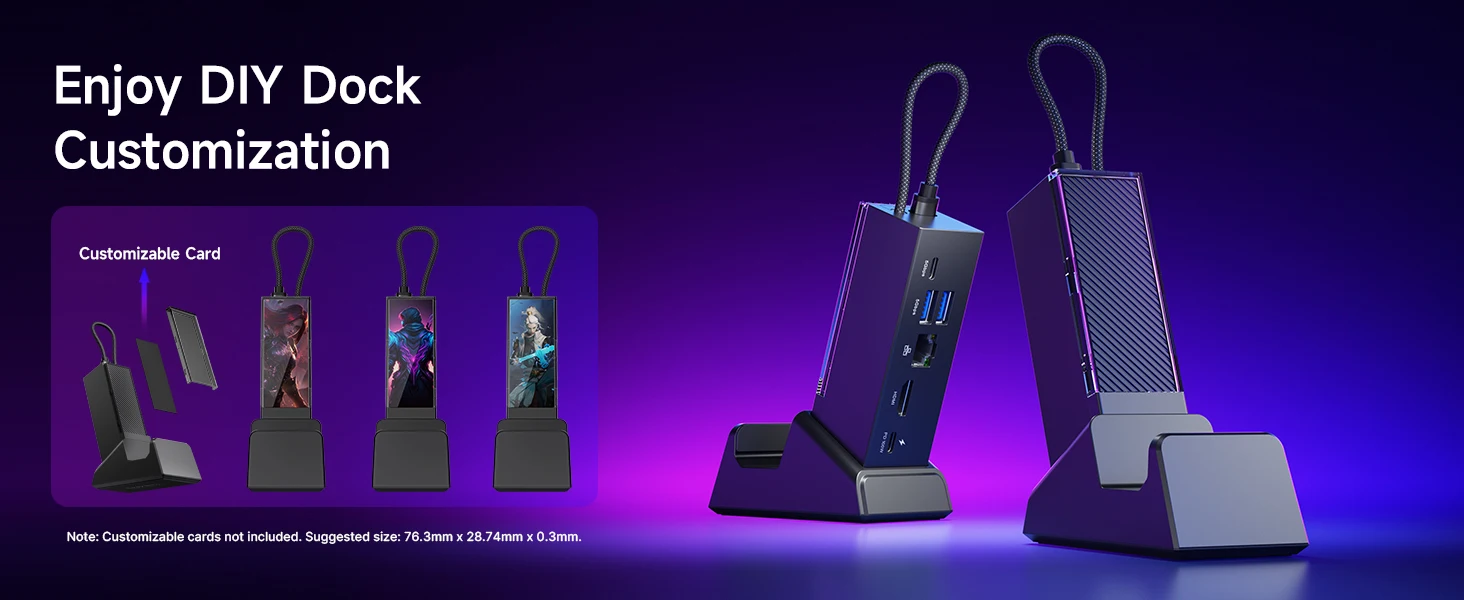 DIY Customize Your Docking Station: Easily personalize your docking station by adding a custom card between the front cover and the dock. Just remove the cover, insert your card, and snap the cover back on. NOTE: Recommended card size is 3.00″ x 1.13″ x 0.01″ (76.3mm x 28.7mm x 0.3mm). Custom cards NOT included