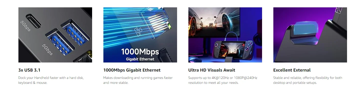 6-in-1 Docking Station for Handheld: Experience enhanced gaming with 4K@120Hz HDMI output, Gigabit Ethernet, USB-C PD charging, USB-C 3.2 Gen 1, and dual USB-A 3.2 Gen 1 ports